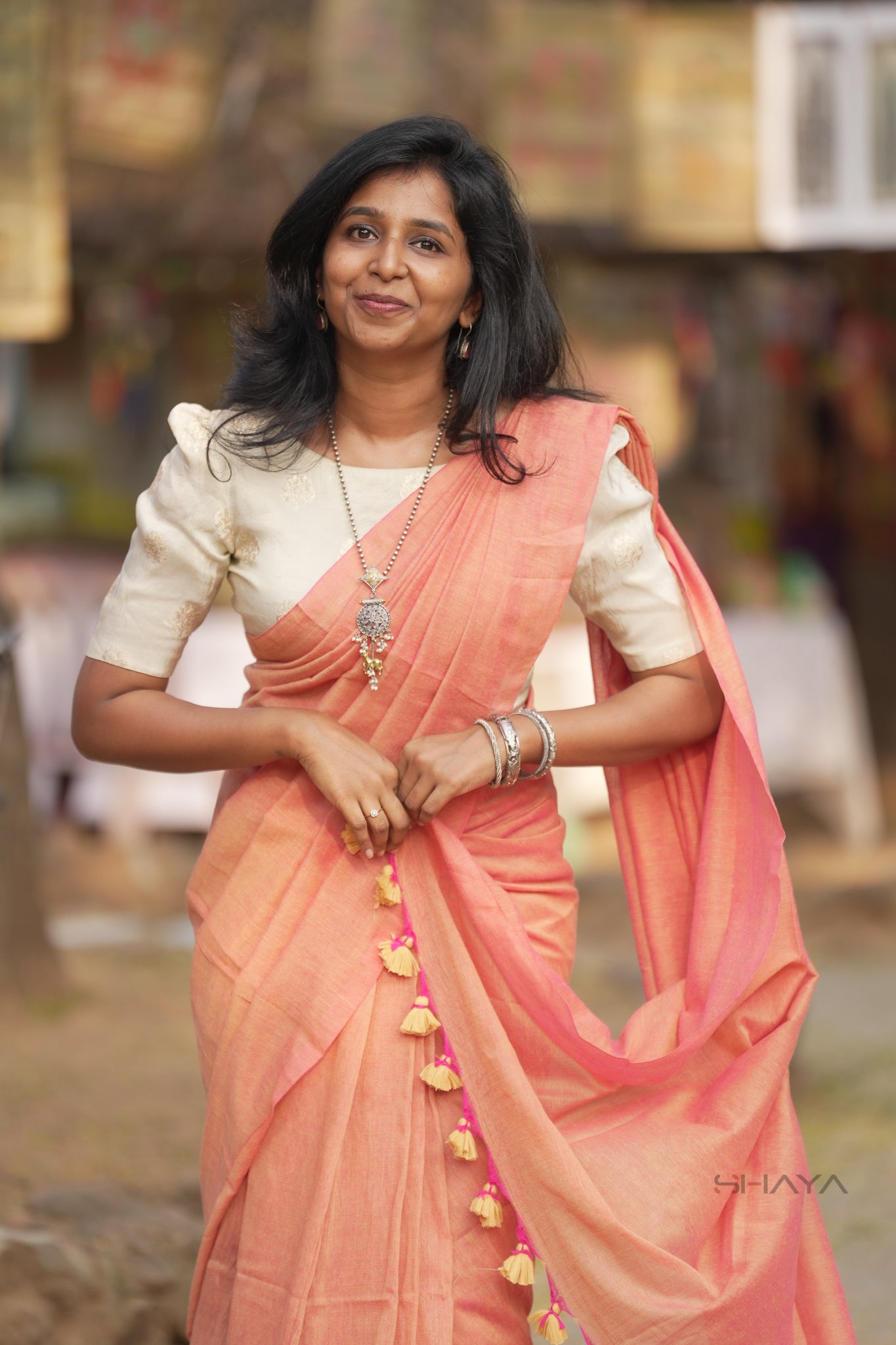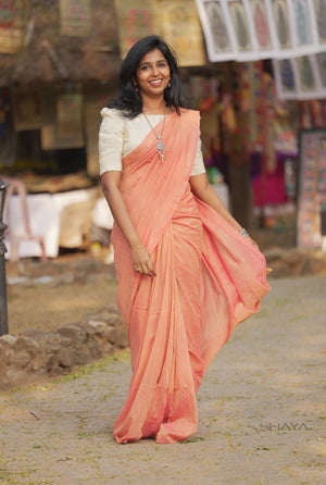 Soft, elegant, and effortlessly graceful, this pastel peach mul cotton saree is perfect for modern everyday wear. Crafted in breathable mul cotton, it drapes beautifully with a lightweight feel. The subtle pastel checks add a refined charm, while the contrast tassel pallu brings a playful yet classy finish. Ideal for office wear, casual outings, and minimal festive occasions.