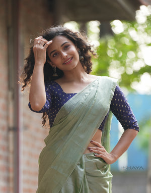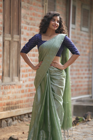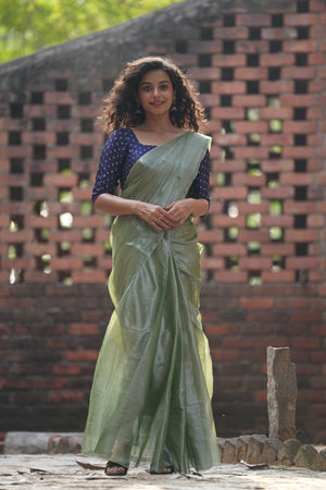 Elegant and refreshing, this sage green mul cotton saree is designed for effortless everyday style. Made from breathable tissue silk it features a soft, fluid drape with a subtle sheen. the saree strikes a perfect balance between modern minimalism and traditional charm—ideal for office wear, daytime events, and casual festive occasions.