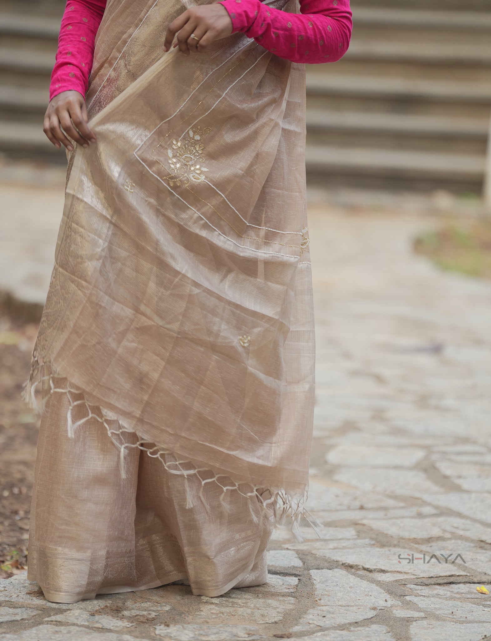 Embrace timeless elegance with this ivory beige handloom saree, crafted in a luxurious cotton silk blend that offers a natural sheen and graceful drape. The subtle woven texture is enhanced with delicate hand-detailed motifs and finished with soft tassels along the pallu, adding understated charm.
